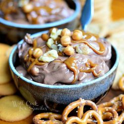 This chocolate cheesecake dip is loaded with bits of caramel, pecans, and drizzled with Dulce de Leche.