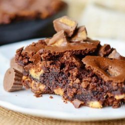 Yummy brownies made with lots of mini peanut butter cups, peanut butter morsels and white chocolate morsels! Super chocolaty and loaded with peanut butter flavors!